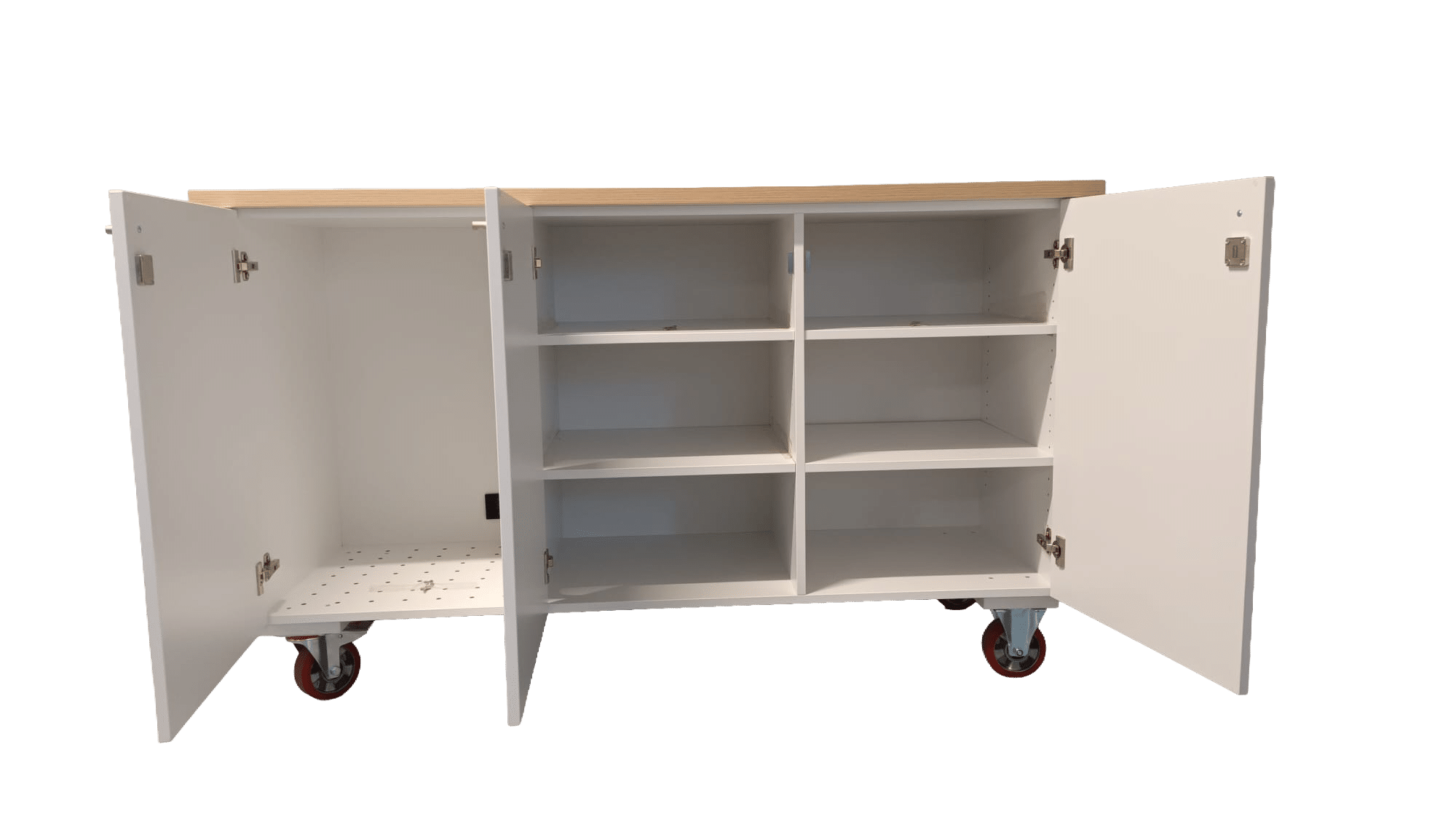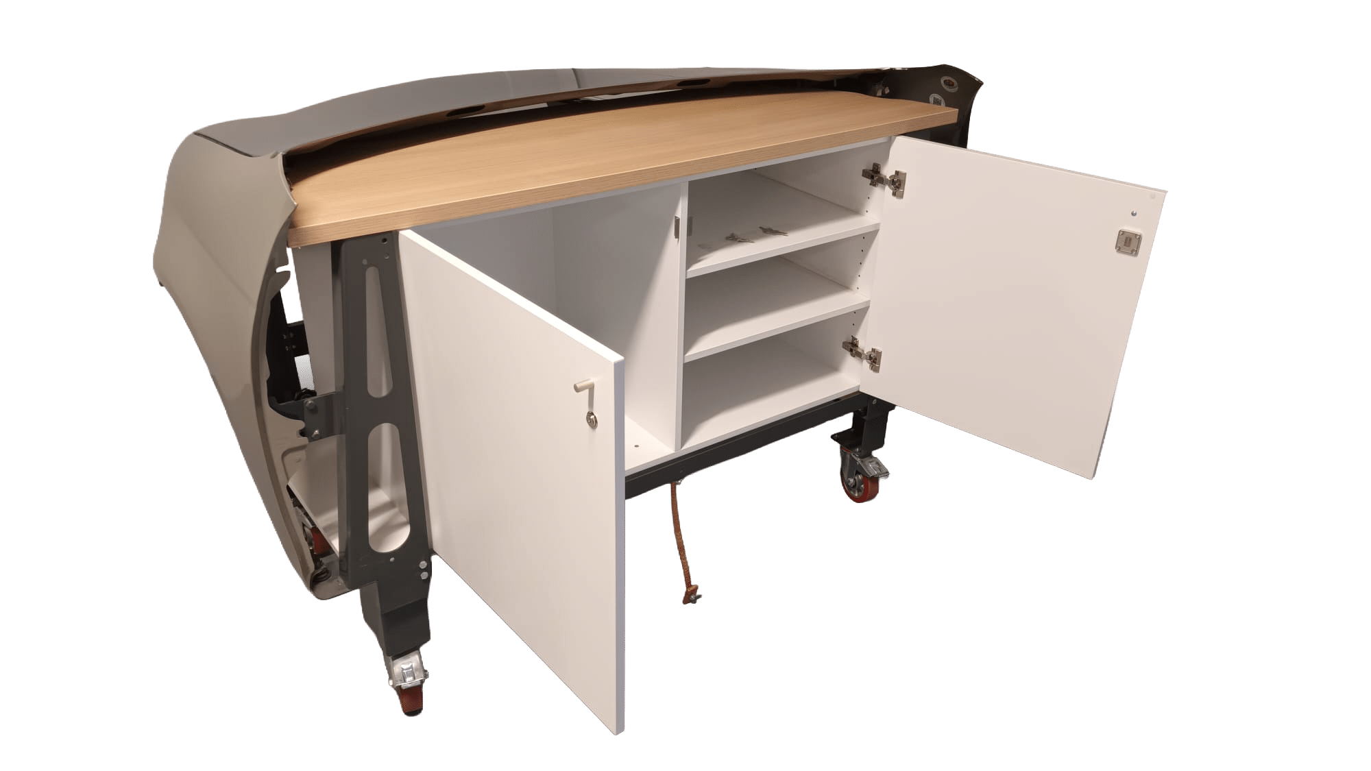 Opstelling frame, met kasten. Op speciaal verzoek, hebben wij ook deze custom order gerealiseerd. Ons opstellingsframe i.c.m. kasten + een los staande balie!